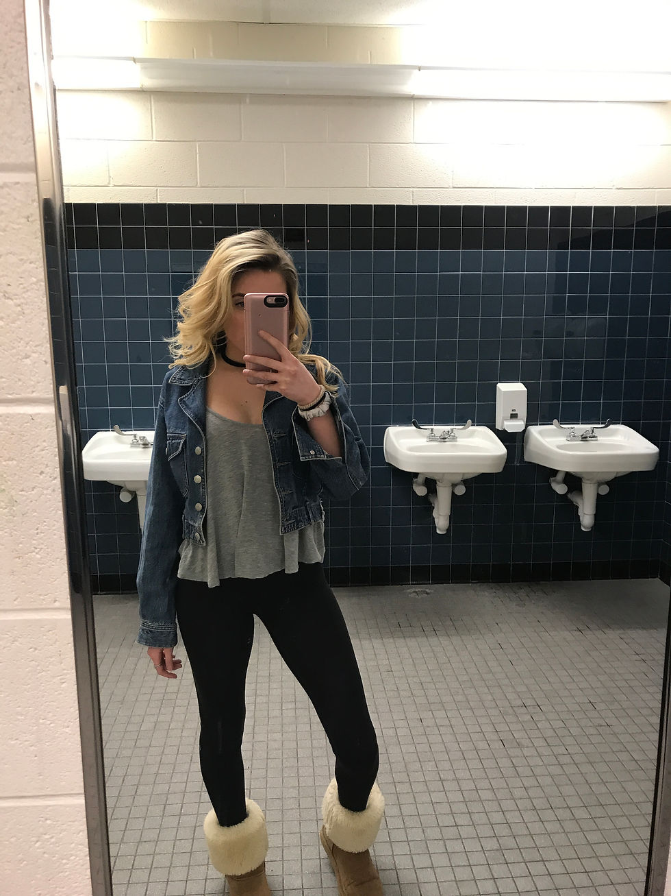 February 6th, 2018Feb 7, 20181 min read In this picture I’m wearing a grey tank top and a jean jacket. I paired that with my Lululemon black leggings and uggs. Finally, I curled my hair and wore a black chocker.